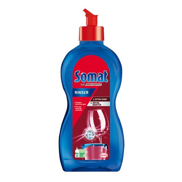Płyn nabłyszczający Somat z efektem wspomagania suszenia zapewnia połysk naczyń, zapobiega zaciekom oraz przyspiesza schnięcie, zwłaszcza naczyń plastikowych.
