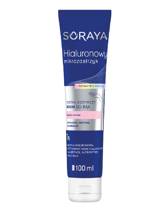 Odżywczy krem do rąk Soraya Hialuronowy Mikrozastrzyk z trzema formami kwasu hialuronowego. Idealny do pielęgnacji skóry przesuszonej i dojrzałej.